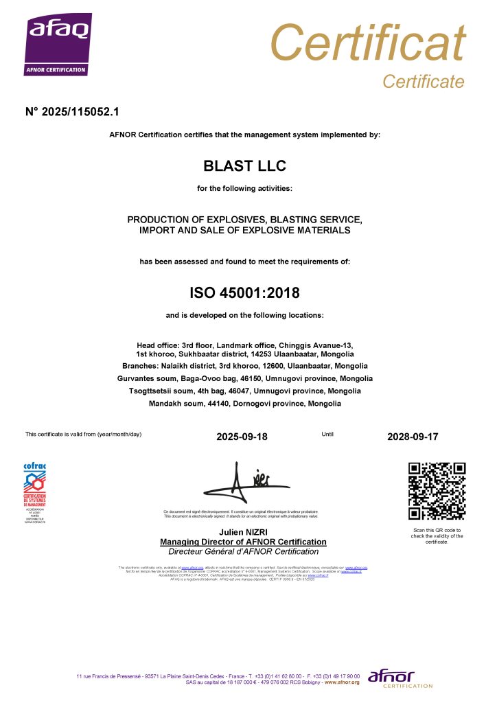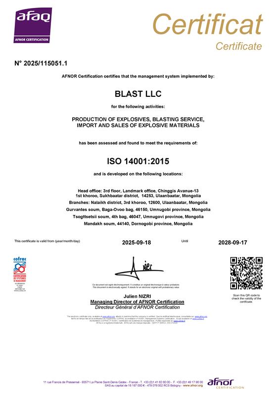 Бласт ХХК нь 2011 оноос хойш ISO 9001:2015 Чанарын менежментийн тогтолцоо, шаардлага стандартыг амжилттай нэвтрүүлж, тогтвортой хэрэгжүүлсээр ирсэн бөгөөд 2025 онд бид давтан баталгаажуулалтын аудитад амжилттай хамрагдаж, гэрчилгээгээ 3 жилийн хугацаагаар сунгуулсан нь бидний тогтвортой хөгжлийн бодлого, чанарын менежментийн тогтолцооны үр дүнтэй хэрэгжилтийн илэрхийлэл боллоо.